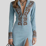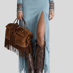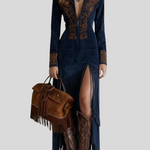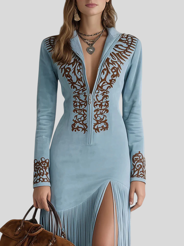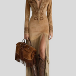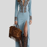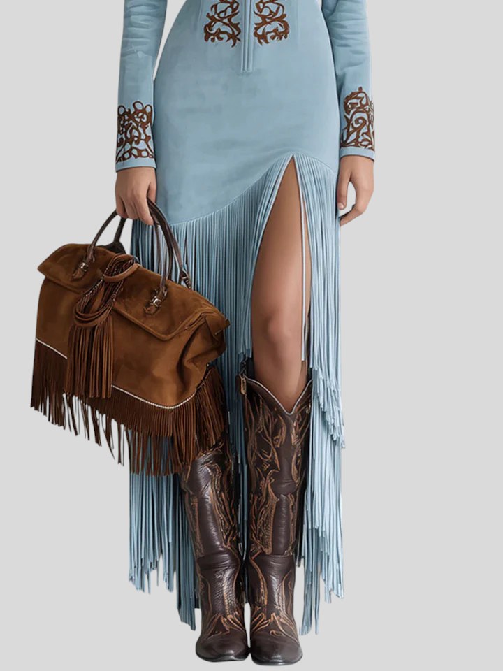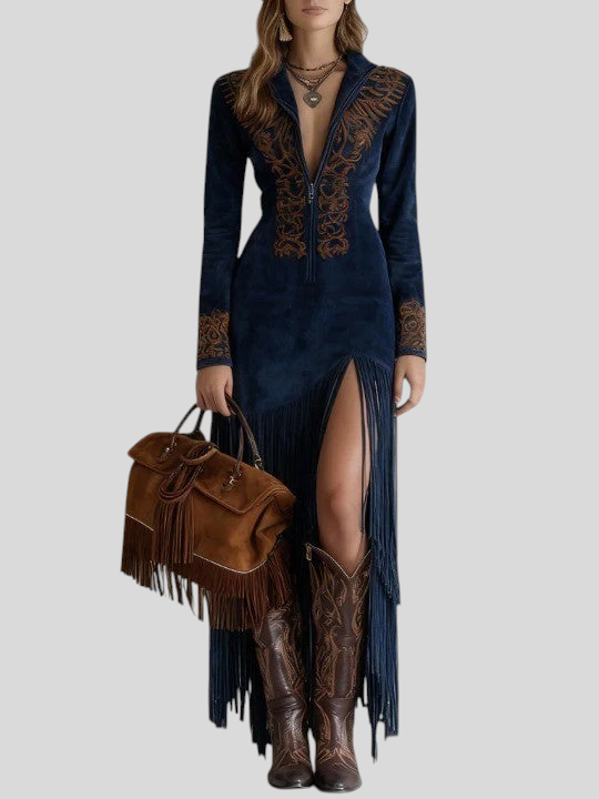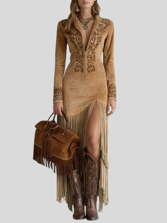 Ova maxi haljina donosi spoj luksuza, boho šarma i ženstvene elegancije. Suede tekstura daje mekani, profinjeni osjećaj, dok bogati vez ističe jedinstven karakter haljine. Polovični patent dodaje moderan detalj, a prednji prorez i duge rese stvaraju prekrasan, fluidan pokret pri svakom koraku. Savršen izbor za žene koje vole izraziti svoj stil kroz upečatljive i originalne komade.