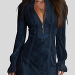 Ova mini haljina spaja mekoću, profinjenost i dozu odvažnosti u savršenom balansu. Baršunasti završetak daje joj sofisticiran izgled, dok čipkasti detalji donose profinjen, ručno izrađen šarm i naglašavaju figuru s prirodnom elegancijom. Dekolte s metalnim patentnim zatvaračem dodaje moderan dodir i omogućuje prilagodbu razine zavodljivosti ovisno o prigodi. Komad stvoren za žene koje žele ostaviti dojam stilom i samopouzdanjem.