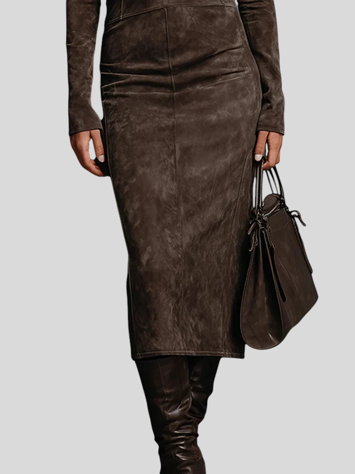 Midi Haljina Od Brušene Kože S Visokim Ovratnikom I Elegantom Siluetom