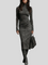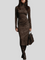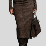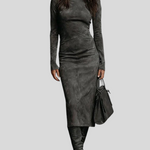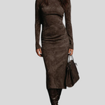 Ova midi haljina od brušene kože kombinira profinjenost i modernu privlačnost. Visoki ovratnik vizualno izdužuje figuru, a dugi rukavi daju uravnotežen, elegantan izgled. Kroj koji prati liniju tijela naglašava obline na sofisticiran način, dok tekstura materijala pruža luksuzan dojam. Savršen je izbor za posebne prilike, večernje izlaske ili trenutke kada želite zablistati uz minimalan trud.