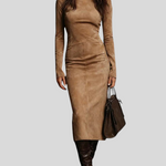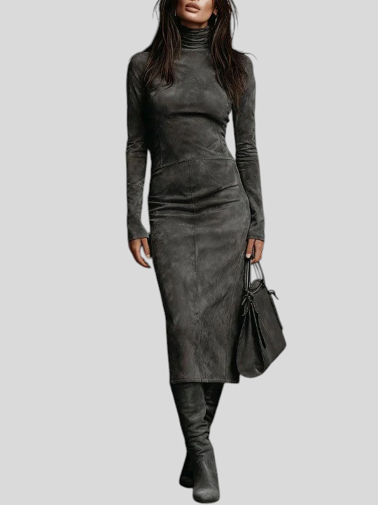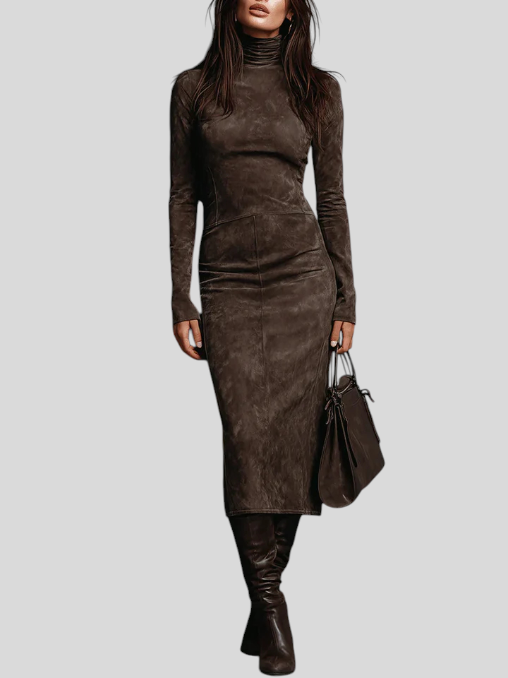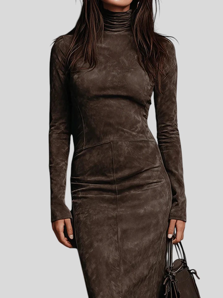 Ilaria – Midi Haljina Od Brušene Kože S Visokim Ovratnikom I Dugim Rukavima