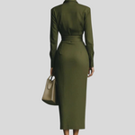 Ova preklopna haljina spaja profinjenost i suvremeni dizajn kako bi prirodno naglasila figuru. Besprijekoran kroj stvara izdužen i profinjen dojam, dok naglašeni struk i strateški drapirani detalji dodaju pokret i šarm. Klasičan ovratnik i vrhunska izrada čine je savršenim izborom za događaje, poslovne prilike ili trenutke u kojima elegancija treba biti u prvom planu. Haljina kreirana za žene koje žele pokazati prisutnost, stil i samopouzdanje.
