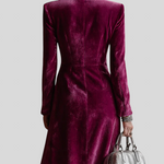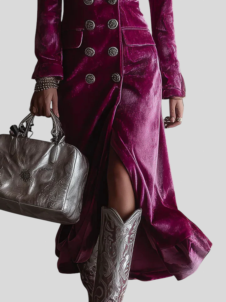 Baršunasti kaput-haljina koji ujedinjuje luksuz, stav i profinjenost u jednom dizajnu. Dugi kroj vizualno izdužuje siluetu, dok metalni dekorativni gumbi dodaju upečatljiv i moderan karakter. Baršun daje bogatu teksturu i profinjeno kretanje, čineći ovaj komad savršenim za sve koji žele snažan i nezaboravan izgled. Idealan je za posebne večeri, događanja ili za trenutno podizanje svakog outfita.