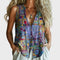 Izdignite svoju umjetničku stranu stila s ovim bezrukavim topom u ljubičastoj nijansi, ukrašenim apstraktnim geometrijskim uzorcima u živopisnim bojama. Dizajn s gumbima pruža praktičnost i eleganciju, dok opušteni kroj nudi udobnost za svakodnevne i ljetne kombinacije.
