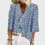 Osvježite svoju svakodnevnu odjeću s ovom majicom u plavoj nijansi, ukrašenom malim bijelim cvjetnim uzorcima. Njen klasični dizajn s tri četvrtine rukava pruža udobnost i eleganciju, dok opušteni kroj čini idealnim izborom za sve doba dana.