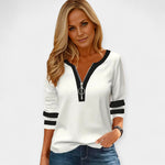 Stilizirana T-majica koja kombinira sportski stil s modernom elegancijom. S V-izrezom i patentnim zatvaračem, kao i upečatljivim color block uzorcima, idealna je za isticanje udobnosti tijekom cijelog dana.