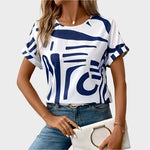 Elegantna majica s modernim apstraktnim dizajnom u plavim i bijelim nijansama. Idealna odjeća za svakodnevne izglede koji se ističu.