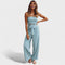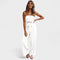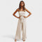 Ovaj moderan kombinezon spaja jednostavnost i sofisticiranost u jednom savršenom komadu. Zahvaljujući ženstvenom kroju bez naramenica, istaknutom struku s pojasom koji se veže te širokim i lepršavim nogavicama, pruža udobnost i stil u svakoj prilici – bilo da je riječ o šetnji gradom, večernjem izlasku ili posebnoj prigodi.