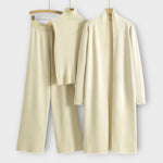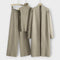 Ovaj set od rebraste tkanine donosi čist i moderan izgled za hladnije dane. Sastoji se od hlača ravnog kroja, majice bez rukava s visokim ovratnikom i dugog kaputa bez dugmadi, nudi eleganciju i udobnost u jednoj ponudi. Idealno za svestrane kombinacije, od kućnog ureda do ležernijih obaveza s puno šarma.