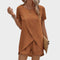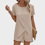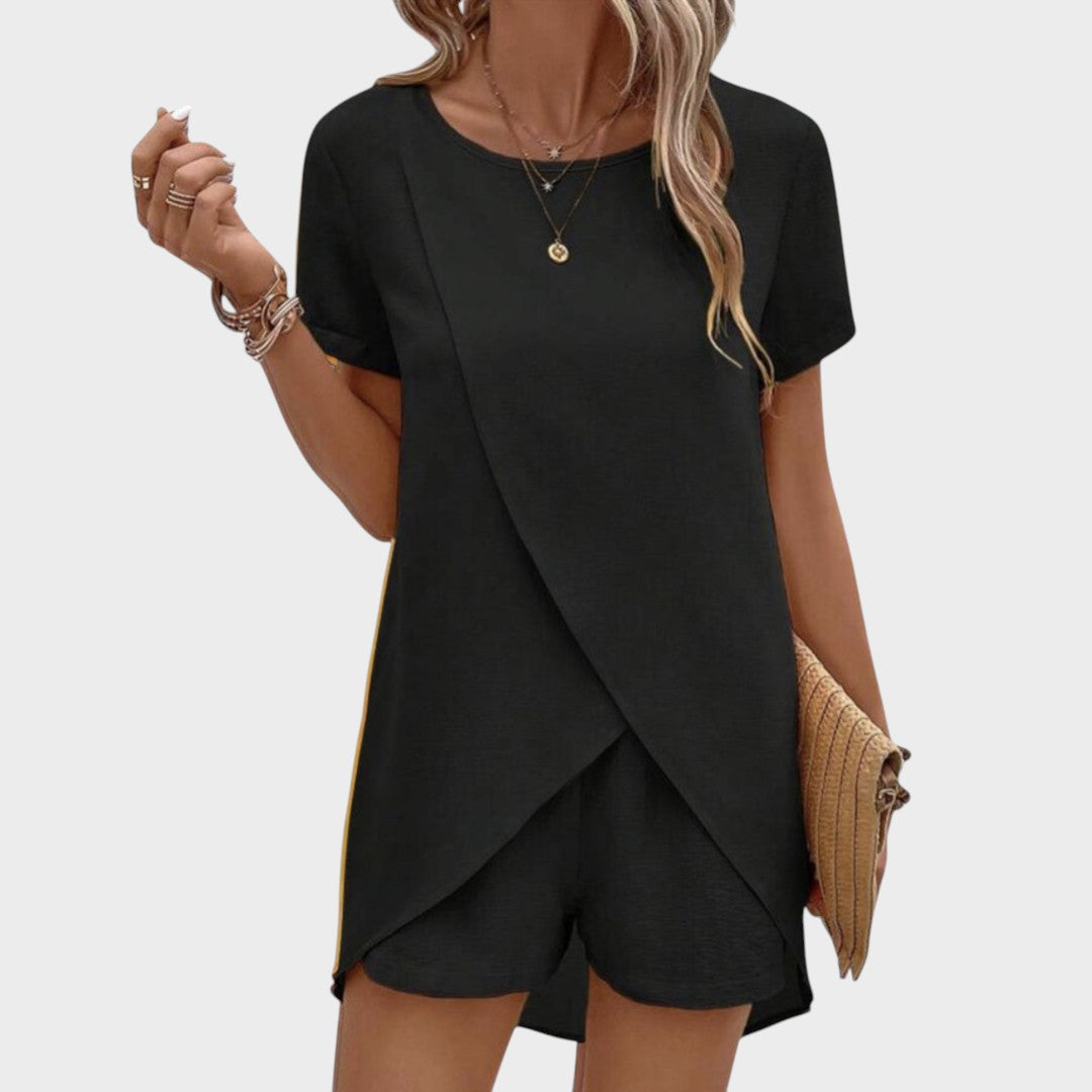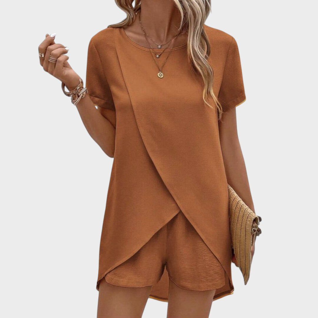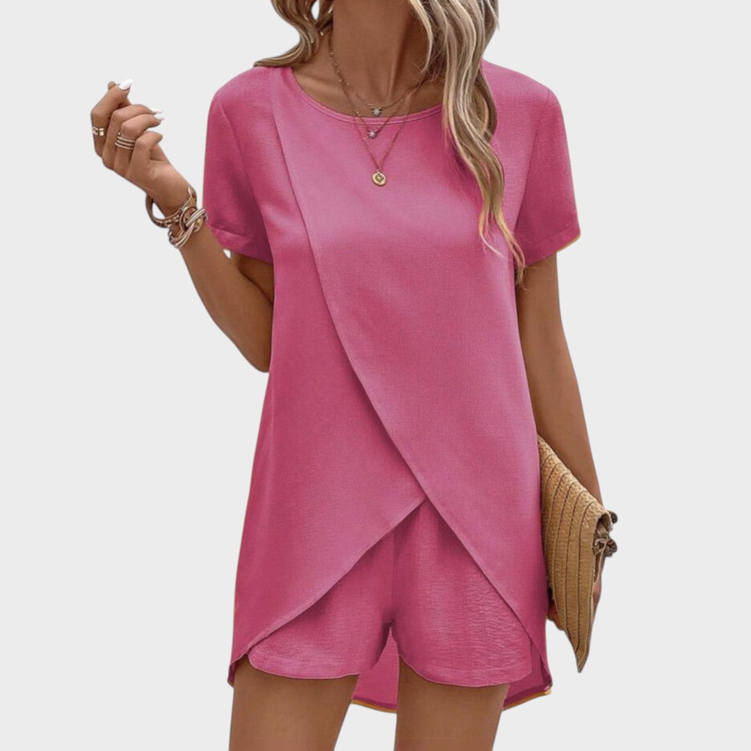 Ovaj moderan komplet sastoji se od lagane bluze s asimetričnim preklopom i udobnih kratkih hlača koje zajedno stvaraju sofisticiran, ali opušten izgled. Prozračan materijal osigurava udobnost čak i u najtoplijim danima, dok elegantan kroj naglašava figuru bez narušavanja slobode kretanja. Idealno za šetnje, putovanja, druženja ili ležerne ljetne večeri.