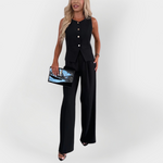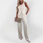 Naš omiljeni elegantni set je savršen spoj stila, udobnosti i diskretne luksuznosti – idealan za žene koje žele istaknuti svoju eleganciju u svakoj prilici. Top bez rukava u kombinaciji s hlačama udobnog kroja stvara šik i modernu pojavu za sve prilike.