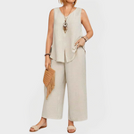 Opustit će vas i sofisticirani set koji kombinira jednostavne linije s modernim karakterom. Bez rukava majica s diskretnim otvorom sprijeda i široke hlače stvaraju efekt koji isijava udobnost i stil.