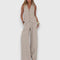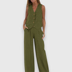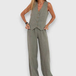 Set Nina kombinira ljetnu laganost s elegantnom jednostavnošću – idealno za vruće dane i stylish izglede. Bez rukava top u uskom kroju susreće ležerne hlače, pružajući modernu, laskavu siluetu.