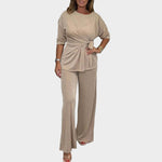 Udoban i elegantan set koji se sastoji od majice s vezanjem u struku i širokih hlača. Idealno za svakodnevne kombinacije i opuštene izlaske, pruža slobodu kretanja i moderni stil.
