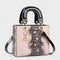 Sa sofisticiranim završetkom u životinjskoj teksturi i metalnim dijelovima visokog sjaja, ova torba je definicija profinjenosti. Strukturirana, s dvostrukim ručkama i dugom uklonjivom trakom, nudi svestranost koja odgovara od formalnih događaja do ležernih trenutaka sa stilom. Aksesor koji trenutno podiže svaku kombinaciju, donoseći šarm i autoritet.