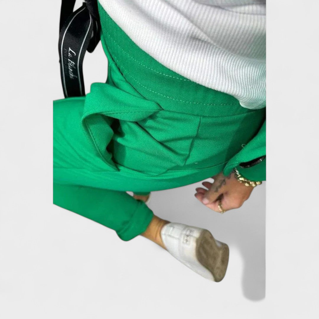 Ovaj individualno prilagođeni komplet s mekanim sakoom i slobodnim sportskim hlačama pruža moderan i udoban spoj koji je savršen za svakodnevno nošenje ili neformalne sastanke. Zeleni komplet s modernim detaljima osigurava izvanredan stil i udobnost tijekom cijelog dana.