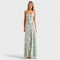 Ova duga haljina kombinira eterealnu čaroliju cvjetnih vezova s prirodno sužavajućom siluetom. Strukturalni izrez i tanke naramenice čine je sofisticiranim izborom za posebne prigode, vjenčanja ili nezaboravne večeri.